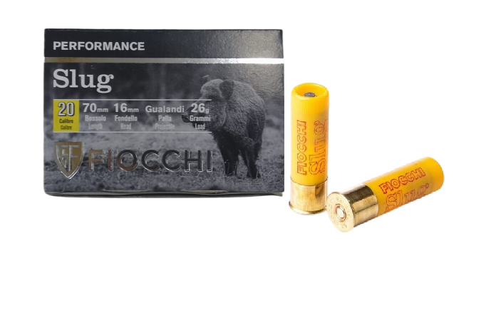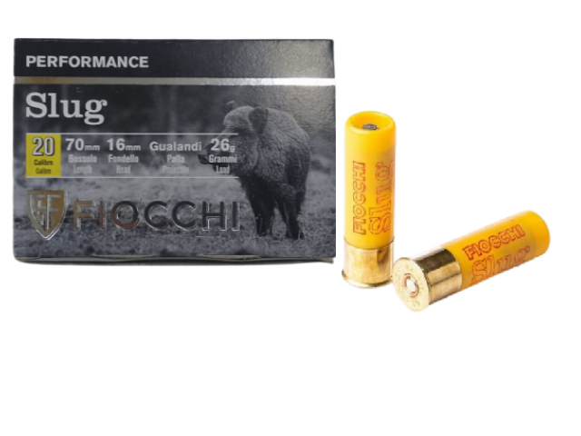 # 870882 - Fiocchi Munizioni Cartucho modelo PERFORMANCE en calibre 20/70 de 26grs. culote de 16 mm. con proyectil SLUG de plomo Gualandi Bullet