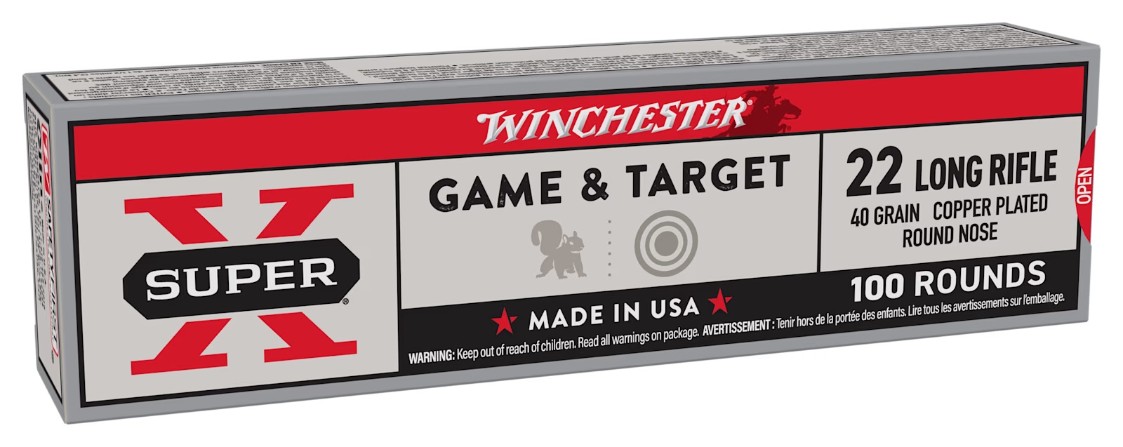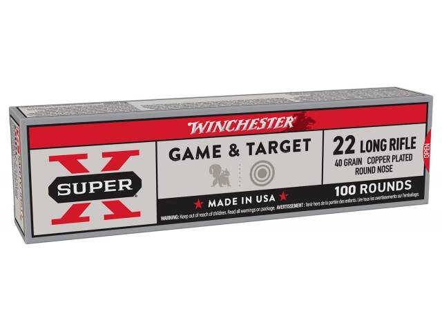# X22LRSS1 - Winchester Super-X® Munición Cal. 22 Lr - 40gr. maciza, cobreada. Alta velocidad 1300 fps. Nuevo envase "retro" de cartulina con 100 unidades. Presentación venta por pack 5 x 100 unids. o múltiplos. Gran precisión. Velocidad superrápida mejorada Fabricado con estándares extremadamente altos Máxima precisión y fiabilidad Bala de plomo revestida de cobre Pólvora de combustión limpia Cebado fiable No viene mas en caja plástica.